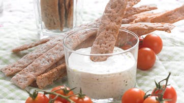 Rør gæren ud i vandet og tilsæt tomatpuré, oregano, salt, hvedekerner og rugsigtemel. Rør dejen godt igennem og stil den tildækket i 20 min. Ælt hvedemelet i dejen og lad den hæve tildækket i 45 min. Varm ovn og bageplader op til 250° og del dejen i 8 stykker. Rul hvert stykke papirtyndt ud på et meldrysset bord og prik dejen tæt med en gaffel. Skær dejstykkerne i 1½ cm tykke strimler og læg dem på bagepapir på de varme plader. Bag stængerne i 6 min. ved 250° og lad dem afkøle på en rist. Server stængerne som snacks - evt. med en god pesto eller dip til.