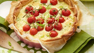 Kom dejen i et 26 cm tærtefad og forbag den ved 200° i 12 min. Damp laksen og pluk kødet i mindre stykker. Snit forårsløgene og skyl tomaterne. Fordel forårsløg og laks på tærtebunden og læg cherrytomaterne over. Pisk æg, fløde og salt sammen og hæld det over fyldet. Drys med revet ost, og bag tærten ved 200° i 30 min.