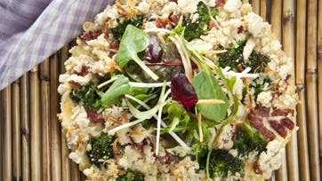 Pluk broccolien i små buketter og blancher dem i kogende vand med salt i et minut. Hæld vandet fra og lad dem dryppe godt af. Pisk æg, hytteost (eller fløde) og mælk sammen og vend ost, salt og peber i. Læg broccolien i en smurt form sammen med baconen og hæld massen i over. Bag tærten i en 190 grader varm ovn i ca. 15 minutter. Arbejd ingredienserne til dejen sammen til en smuldret masse, fordel den på tærten og bag den yderligere 15 minutter.