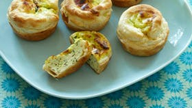 Rul butterdejen ud og udstik 12 cirkler, der passer til portionsmuffinsforme. Tryk dejen ud i formene og sæt dem på køl i 30 min. Rør osten med æg, mælk og revet parmesan. Tag bladene af brøndkarsen og hak dem fint. Blend stilkene og rør begge dele i æggemassen. Smag til med salt og peber. Fordel massen i de 12 forme og bag dem ved 220º i 25 min., til overfladen er gylden og massen fast.