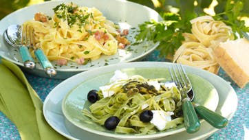Skær baconen i tern og hvidløgene i skiver. Rist begge dele på en pande i olien. Tilsæt mælken og kog det småt et par min. Pisk det hele æg, æggeblommerne og parmesanen sammen i en skål. Kog pastaen al dente og lad den dryppe af i en sigte. Bland nu den varme pasta i baconblandingen. Bland æggene i, vend det hele rundt, så æggene gryner lidt, og servér straks din pasta carbonara på varme tallerkener sammen med hakket persille og evt.