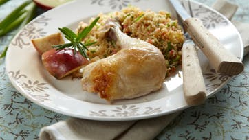 Gnid kyllingen med salt og skær æblerne i mindre stykker. Kom æblestykkerne i kyllingen sammen med rosmarin og steg den ved 200° 60 min. Hæld 2 dl kogende vand over couscousen, tilsæt olie og salt og lad det trække i 10 min. Fjern kernerne fra agurk og tomater og skær dem i små tern. Skær forårsløget i ringe og abrikoserne i små tern. Bland couscousen med mynte, paprika, citron, salt og peber og vend agurk, tomat, abrikos og forårsløg i. Smag til med tabasco og server.