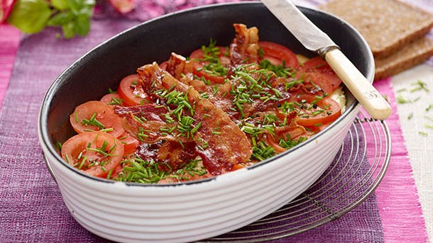 Bag den i ovnen ved 175° i 25 min., læg tomaterne på og giv den yderligere 5 min. Server med den sprøde bacon, klippet purløg og rugbrød.