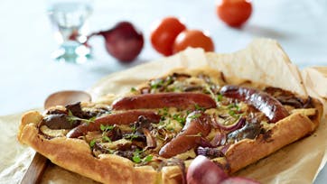 Rør dejen sammen, rør melet med lidt af mælken, til den ikke klumper, dejen bliver som en pandekagedej. Kom den i en høj bradepande. Rist pølserne, rist leveren på en anden pande til begge dele er godt brunede. Steg løgene. Læg løg, pølser og lever i æggemassen. Bag retten ved 200° i 45 min. Drys med timian og server med tomatsalat.