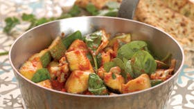 Skru ned og tilsæt resten undtagen spinaten (kikærterne skal enten være fra dåse eller udblødte og kogte). Kog under låg ved lav varme - tilsæt evt. lidt vand - i ca. 30 min. Smag til og vend spinaten i 3 min. før servering. Server med kogte basmatiris.