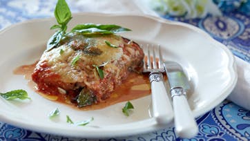 Skær auberginerne i aflange skiver og salt dem. Kom en anelse olie i en gryde og steg de hakkede løg, hvidløg og hakkede gulerødder i 5 min. Tilsæt tomater, salt og peber og lad det koge mørt i 10 min. Blend det. Børst saltet af auberginerne og steg dem i olie, til de er gyldne. Riv emmentaler og parmesan og skær mozzarellaen i skiver. Læg fyldet og auberginer i lag i et ovnfast fad, start med auberginer, så tomatsovs, så basilikum og til sidst de fire slags ost - og gentag. Sættes i ovnen ved 200° i 30 min., til osten bobler lystigt. Serveres med salat og brød til.