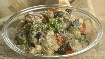 Skær auberginerne i tern og steg dem i olie, drysset med salt og peber. De skal være lysebrune og gennemstegte, det tager ca. 15-20 min. Kålen blancheres og duppes tør. Det hele blandes, og dressingen røres sammen og hældes over. Drysses med sesamfrø. Stilles køligt, til det skal serveres. Kan sagtens laves om formiddagen til samme aften.