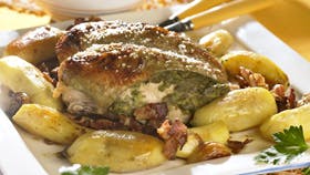 Skræl kartoflerne og kog dem 3-4 min. i letsaltet vand. Hæld vandet fra og læg kartoflerne i bradepanden ved siden af kyllingebrystet. Del hvidløget i fed og pil dem. Kog dem 5 min. i letsaltet vand. Skær baconen i tern og rist dem kort på tør pande eller i mikroovn. Læg bacon og hvidløg ned til kartoflerne. Sæt det i ovnen på midterrillen ved 175° ¾-1 time, til brystet lige netop er gennemstegt, prøv med en kødnål, kødsaften skal være klar. Server med tomatsalat.