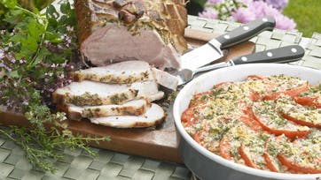 Skær forsigtigt vandret gennem fedtbræmmen og ud til siderne, så den deler sig i 2 tynde flader. Bland krydringen og smør den på kødet. Læg fedtbræmmen på plads og hold det hele fast med nogle tandstikkere. Rids stegen forsigtigt. Læg hamburgerryggen i en lille bradepande og sæt den i ovnen 40 min. ved 160°. Skru op til 180° og steg yderligere 10-12 min.
