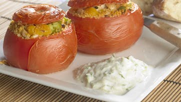 Hæld couscous i en skål sammen med salt og olivenolie, hæld vandet over og lad det trække i 10 min. Hak løgene fint og skær peberfrugten i små tern. Skær kødet i små stykker og bland dem i grønsagerne. Tilsæt citronmelisse, abrikos, paprika, citronsaft og tabasco og smag til. Skær toppen af tomaterne og udhul dem, fordel fyldet i, læg toppene på og bag dem ved 200° i 15 min. Server med tzatziki og flute.