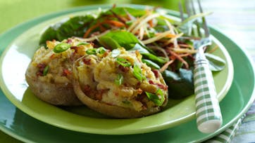 Vask kartoflerne, skær et kryds i hver og bag dem i ovnen ved 200º i 60 min. Rist baconternene sprøde, hak forårsløg og chili og lad dem riste med et par min. Skær toppen af bagekartoflerne, udhul dem og mos indholdet med mælken. Vend baconblandingen i mosen og smag den til med salt og peber. Kom mosen tilbage i kartoffelskallerne og bag dem ved 210º i 15 min. Rør cremefraichen med sennep og hakket persille og smag den til med salt og peber. Servér kartoflerne med cremefraiche-dressingen og en god salat.