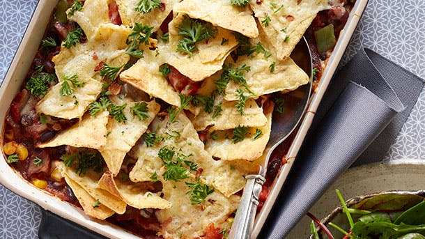 Bred tortillachipsene jævnt ud over retten og drys med revet cheddar.