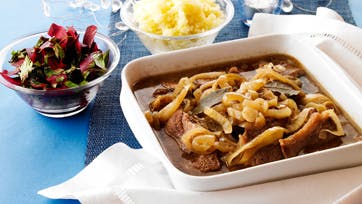 Skær kødet i tynde skiver og vend det i mel med salt og peber. Brun det i blandingen af de to fedtstoffer. Kom løgene ved og lad dem tage farve. Dæk med vand og kom laurbærblade i. Kog, til det er mørt (ca. 1 time). Smag til og server med rødbedesalat el. syltede rødbeder og kartoffelmos.