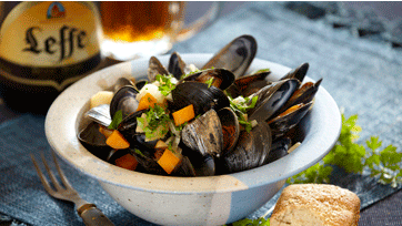 Kassér de skyllede muslinger, hvis skallen er gået i stykker, eller hvis de ikke åbner sig, når de bankes let mod bordkanten. Pil og hak løg, hvidløg, gulerod og persillerod. Varm en stor gryde op med olie og svits grønsagerne 4-5 min., uden at de bruner. Kom muslingerne i gryden sammen med timian. Hæld øl over og læg låg på. Ryst gryden og lad muslingerne dampe ca. 5-7 min., til de har åbnet sig. Sæt gryden på bordet og spis muslingerne med brød til eller som i Belgien med fritter og mayonnaise.