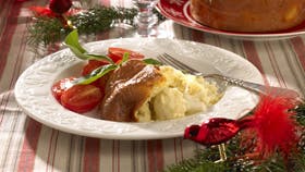 Del blomkål i buketter og kog i 5 min. i saltet vand. Hæld vandet fra. Afbag mel og smør og spæd med mælk. Kog igennem i 3 min. Rør æggeblommerne i, når mælken er afkølet let, og pisk hviderne stive. Fold dem i massen. Smag til med salt og peber. Kom blomkålen i en smurt, raspet gratinskål. Kom æggemassen over, drys med ost og stil det i ovnen ved 175° i 45-60 min. til den er gylden og fast. Serveres med tomatsalat og flute.