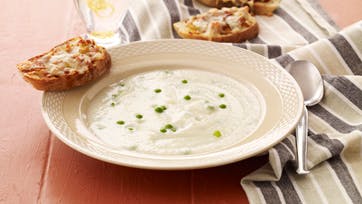 Skær blomkålen i grove tern og kog den under låg i ½ l vand uden salt i 15 min. Skær forårsløget i tynde skiver, blend hvidløg, tomater og kogende vand til en glat pasta og rør forårsløgene i. Skær flutet i skiver og smør tomatblandingen på. Drys med revet ost og bag brødene ved 225° i 5 min. Blend blomkålen med lidt af kogevandet og fløden til en cremet konsistens. Kom ærterne i suppen og varm igennem. Smag til med salt og peber og servér med brødene.