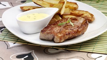 Steg bøfferne ved middelhøj varme i 5 min. på hver side. Pisk æggeblommer med bearnaiseessens og salt over vandbad eller ved meget svag varme, til de er seje og skummende. Pisk eller stavblend smørret i lidt ad gangen og smag til med hakket estragon. Server bøffen med ovnbagte pommes frites.