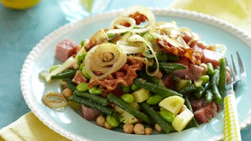 Steg baconskiverne sprøde ved høj varme og lad dem dryppe af på et stykke køkkenrulle. Skyl kikærterne, skær kartoflerne i tern og damp de grønne bønner let. Pisk olie, eddike, persille og kapers sammen og vend kikærter, kartoffeltern og bønner i. Skær mørbraden i små tern og vend dem i salaten. Pil løg og hvidløg og skær skalotteløgene i kvarte og hvidløgene i skiver. Svits løg og hvidløg, til de begynder at tage farve. Tilsæt siruppen og steg i yderligere 2 min. Anret bønneblandingen på et fad og fordel bacon og løg over.