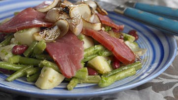 Kog kidneybønner og kartofler møre i hver deres hold letsaltet vand og damp de grønne bønner let. Pisk olie, eddike, persille og kapers sammen til en dressing. Skær kartofler og grønne bønner i mundrette stykker og bland dem med kidneybønner og dressing. Anret på et fad og læg skiver af mørbrad over. Pil løg og hvidløg og skær skalotteløgene i kvarter og hvidløgene i skiver. Svits løg og hvidløg i olien til de begynder at tage farve. Tilsæt siruppen og steg i yderligere 2 min. Fordel løgene over mørbraden og server.
