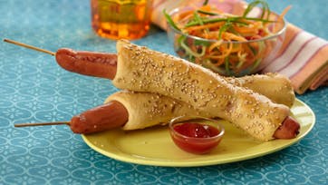 Del dejen i 6 firkanter og smør hver firkant med sennep eller ketchup. Sæt hver pølse på en pind og pak dem ind i dejstykkerne. Pensl med sammenpisket æg, drys med sesam og bag dem midt i ovnen ved 175° i 15 min. Skær agurk og gulerødder i tynde skiver med en kartoffelskræller. Skær snackpeberne i tynde ringe. Pisk eddike, vand, sukker, salt og peber, til sukkeret er helt opløst, hæld det over grønsagerne og lad det trække i mindst 20 min.