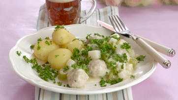 Rør en fars af alle ingredienserne og lad den hvile i 30 min. på køl. Form små boller og kog dem i letsaltet vand i 4 min. Tag dem op, men gem vandet. Steg stykker af renset bladselleri og små tern af skrællet selleri i smør og drys med mel. Spæd op med kogevandet og rør til en glat, jævnet sovs. Tilsæt kødbollerne og lun igennem. Server med kartofler, salat og evt. et drys persille og lidt citron.