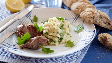 Gnid kæberne med salt, peber, revet citronskal og hakket timian og lad dem trække i 20 min. Brun dem i olivenolie sammen med hakket løg og hvidløg. Hæld vin, citronsaft og vand ved, lad dem simre under låg i 45-60 min., til de er møre. Skræl og halver persillerødderne. Skræl og skær sellerien i mindre stykker. Kog urterne møre i letsaltet vand, blend dem med lidt af kogevandet og vend dem med hakket persille, lidt olivenolie og salt. Server kæberne med groft brød og skyen fra kæberne, der kan søbes op med brødet, samt mosen.