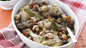 Vend andelårene i mel med salt og peber. Brun dem grundigt i olien i en stor, tykbundet gryde og tag så andestykkerne op. Brun løg, hvidløg og gulerødder i samme gryde, kom andelårene tilbage og kom krydderurter og vin ved. Læg låg på og lad det småsimre ved laveste varme i 1½ time. Tag and og urter op og si skyen der også skal skummes for fedt (dette bruges til kartoflerne). Hvis retten laves i god tid, kan den fryses på dette tidspunkt eller bare sættes i køleskabet til næsten dag. Jævn skyen og smag til. Blancher bønner og steg kartoflerne. Server andelår med bønner og kartofler.