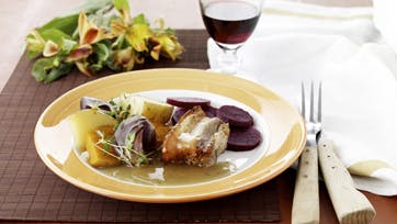 Skær svinebrystet i 8 firkanter, krydr med salt og peber og brun dem i smørret. Vask kartofler, skræl yams/søde kartofler og løg og skær dem i grove stykker. Kom rodfrugterne i et ovnfast fad sammen med hvidløg og timian. Læg svinebryststykkerne over og sæt fadet i ovnen ved 180° i 30 min. Hæld bouillonen ved, dæk med stanniol og lad det stege videre ved 160° i yderligere 1 time. Rør majsstivelsen ud i lidt vand, jævn stegeskyen og server med syltede rødbeder.