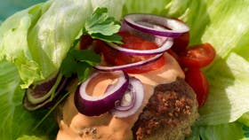 Servér burgerbøffen på salatblade med tomat, rødløg og dressing.