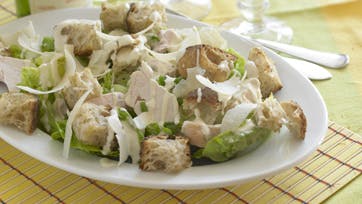 Tænd ovnen på 200° og vend brødet med olie, salt og peber. Drys også kyllingen med salt og peber og sæt begge dele i ovnen i 10 min. eller mere, til det er brunt, og kødet gennemstegt. Rør cremefraiche med sennep, worchestersovs, hvidløg og lidt citron. Hak forårsløg og skyl salaten. Vend salatbladene med løg og kyllingestykker og vend så dressingen rundt, så det kan marinere kødet og de grønne blade. Drys med brødstykker og høvlet eller revet parmesan.
