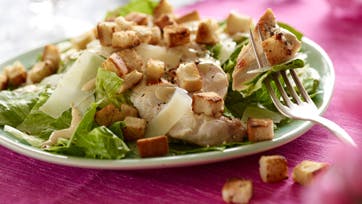 Krydr kyllingefileterne med salt og peber, grill dem ved jævn varme 5 min. på hver side og lad dem køle af, skær dem i mindre stykker. Skær brødskiverne i tern og bland dem med et fed presset hvidløg, salt og peber, steg dem sprøde i smørret. Kom æggeblomme, det sidste fed hvidløg, sennep, eddike, ansjosfileter og 15 g af parmesanen i en blender og blend. Tilsæt olien lidt ad gangen og smag dressingen til med salt og peber. Skyl salaten, riv den i mindre stykker og kom den på et fad sammen med kyllingekødet og flager af parmesan. Fordel dressing og brødcroutoner over salaten og server.