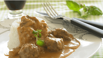 Rør oksekødet med de øvrige ingredienser til kødbollerne. Form farsen til 3 cm store kødboller, brun dem i lidt olie og tag dem af panden. Steg champignoner og løg i lidt smør på panden. Tilsæt tomatkoncentrat, sennep, bouillon og fløde og bring det i kog. Kom kødbollerne i sovsen og lad dem koge med ved svag varme i 10-15 min. Smag retten til med salt og peber og jævn sovsen med lidt majsstivelse udrørt i mælk. Server med ris eller pasta.