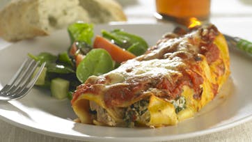 Skær kyllingefileterne i små tern og svits dem i olien med løg og hvidløg. Tilsæt spinaten og lad den svitse med i et par min. Rør blandingen med ricottaost og smag til med salt og peber. Bland tomaterne med salt, peber og oregano og hæld halvdelen i et ovnfast fad. Skær lasagnepladerne i 12 cm lange stykker og rul kyllingefyldet ind i stykkerne. Læg rullerne i fadet og hæld resten af tomaterne over. Drys med revet ost og bag ved 225° i 20 min. Server med salat.