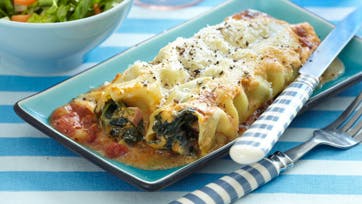 Hak løg og hvidløg og sautér det i smørret. Tilsæt spinatbladene, krydr med salt og peber og lad dem falde sammen. Kom spinaten i en sigte og lad væden løbe fra. Skær skinken i tern og vend dem i spinaten sammen med smuldret gedeost og mozzarella. Skær lasagne pladerne i 10 cm lange stk., kom skinkefyldet på og rul dem sammen. Kom tomatsaucen i bunden af et ovnfast fad og læg rullerne over. Fordel bechamelsaucen over og stil fadet i ovnen ved 190° i 30 min. servér med en god salat til.