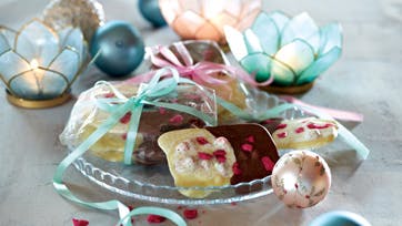Smelt hvid chokolade over vandbad. Smelt mælkechokoladen over et andet vandbad. Rør dem begge med lidt tørrede bær eller musli. Afsæt 8 eller flere skabeloner på bagepapir tegnet efter et kreditkort. Smør halvt hvid chokolade på hver. Så halvt mælkechokolade. Drys med kandiserede rosenblade. Lad dem størkne et tilpas mørkt og køligt sted. Pak i små bunker og giv som hyggelige adventsgaver.