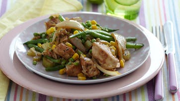 Skær løgene i både og bladsellerien i skiver og brun dem på en anden pande. Bland løg og bladselleri med kyllingen og tilsæt fond, haricot verts og majs.