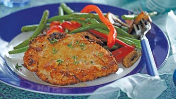 Blend brød, parmesan, timian, salt, peber og revet citrusskal og vend kyllingebrysterne heri. Steg kyllingebrysterne i olien ved middelhøj varme i 6-7 min. på hver side, til de er gennemstegte. Skær champignonerne i kvarte, nip bønnerne og skær peberfrugten i strimler. Rist champignonerne gyldne i lidt olie ved høj varme og tilsæt bønner og peberfrugt. Pres saften fra citronen og appelsinen, hæld den over grønsagerne og lad dem simre et par min. Smag til med salt og peber og servér.