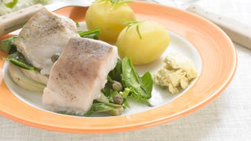 Skær sejfileten i tre stykker, krydr med salt og peber og skær citronen i skiver. Skyl spinaten og skær fennikelen i tynde skiver. Bland spinat, fennikel, kapers og persille og fordel det i bunden af et ovnfast fad. Læg sejstykkerne og citronskiverne over og hæld vinen ved. Dæk fadet med stanniol og damp fisken i ovnen ved 180° i 30 min. Rør smørret med sennep, estragon og hvidløg og server med kogte kartofler.