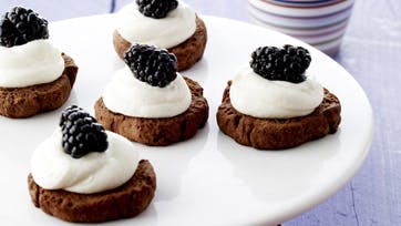 Skær dejen ud i skiver og tryk småkagerne flade. Bag dem i en varm ovn ved 200 g ca. 3 min. på hver side. Lad småkagerne afkøle på en rist. Pynt kagerne med yoghurt og brombær.