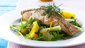 Skræl citrusfrugterne og skær fileter ud af dem. Pres saften af hinderne og pisk den sammen med olie. Skær agurk og bladselleri i tynde stave og vend dem i frugten sammen med rucolasalat og olie. Server den stegte laks med salaten til.