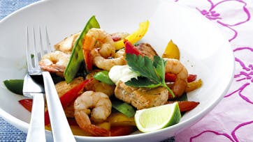 Del laksen i mindre stykker og striml peberfrugterne. Varm en pande med fedtstoffet og steg fisk, rejer og grønsager sammen, til laksen er tilpas mør. Krydr med salt og peber og dryp med lidt limesaft. Rør mayonnaisen med revet limeskal og limesaft.