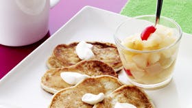 Server klatkagerne med en klat yoghurt på og frugtcocktail til.