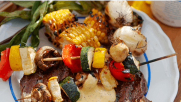 Læg spiddene i vand. Del majskolberne i tre dele. Skær squash, peberfrugt og champignon i tern og sæt dem på spiddene. Pensl spid og kød med marinaden og læg det på grillen sammen med majs og halverede løg. Pensl med marinaden indimellem. Samlet stegetid på grillen er ca. 10 min.