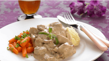 Skær svinekødet i tern og brun baconternene i smørret. Tilsæt svinekødet og lad det brune med i et par min. Knus eller hak enebær og rosmarin og kom det ned til kødet. Tilsæt fløde, salt og peber og lad retten småsimre under låg i 45 min. Jævn retten med majsstivelsen rørt ud i lidt vand, tilsæt kulør og server med mos og dampede karotter.