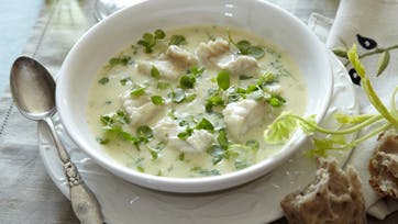 Hak løg, hvidløg og bladselleri. Sautér løg, selleri og hvidløg i smør i en gryde. Drys melet over, når melet er optaget, tilsættes bouillonen lidt ad gangen, så suppen jævner uden at klumpe. Kog den igennem i 5 min. Skær fisken i store stykker og læg dem i suppen, koges ved lav varme i 4 min. Tag fisken op og spæd suppen med fløde og hakket brøndkarse og smag til med salt og peber. Læg fisken i suppen og varm igennem. Server med brød og citron til.