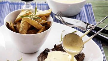 Begynd med kartoflerne. Skræl og skær i pommes frites (evt. med jern). Gives et lille opkog i vand i 30 sek. Duppes tørre og frituresteges i hed olie (husk låg ved siden af). Drysses med salt og kan varmes i ovnen. Æggeblommerne piskes seje med salt og citron over vandbad. Kom 1-2 spsk. vand i og rør så smeltet smør i dråbevis under omrøring. Smages til med estragon.