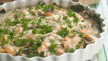 Skyl spinaten og kom den i et smurt ovnfast fad med fiskefileterne over. Bland rødløg, champignoner, timian, knust hvidløg, salt og peber og fordel blandingen over fisken. Læg lakseskiverne, så de dækker fadet og rør æg, ost og fløde sammen. Hæld æggemassen over laksen og bag fiskefadet ved 200° i 35 min. Drys med hakket persille og server med flutes eller nye persilledryssede kartofler og koldt smør.