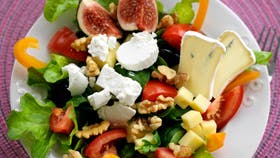 Bland ingredienserne sammen til en frisk og grøn salat. Pynt retten med figner.