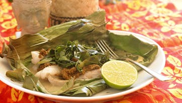 Kom fiskestykkerne lagvist i en pakke med bagepapir. Mellem hvert lag smøres karrypasta på fisken, og der lægges strimlede kaffir-limeblade og hele blade af koriander på. En blanding af fiskesovs, sukker, æg og kokosmælk hældes ved hver pakke, der lukkes og dampes i ovnen ved 180° i ca. 10 min. Fisken kan også serveres i bananblade, hvori den kan dampes - som vi har gjort det på billedet. Server med sticky rice, som tilberedes efter anvisning på posen/pakken.