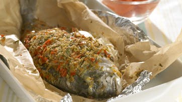 Sauter løg i olie med halvdelen af citronen, ingefær, chili, hvidløg og stødt koriander. Bland risen med plukket timian, salt, peber og halvdelen af de sauterede krydderier. Blend eller mort resten sammen med frisk koriander og rør det med lidt mere olie. Kom risblandingen ind i fiskens bug og læg den på bagepapir og dernæst i alufolie. Smør den blendede masse på fisken og luk pakken til om den. Bag ved 180° i 35 min. Server med tomatsalat til.